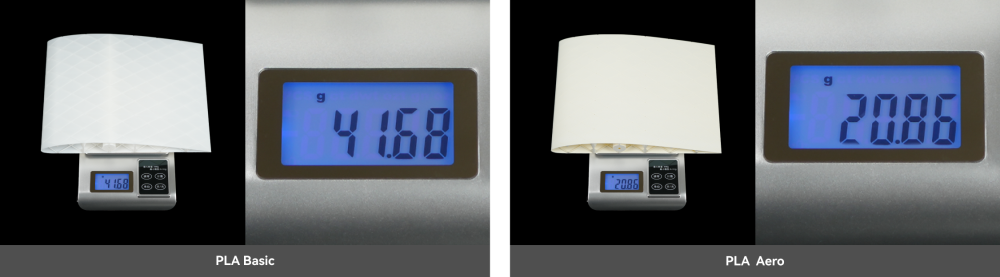 PLA Aero dosahuje nízké hustoty a hmotnosti tím, že během tisku při vyšších teplotách pění a vytváří malé dutinky uvnitř výtisku. Díky tomu je ideální volbou pro energeticky úsporné a lehké výtisky.